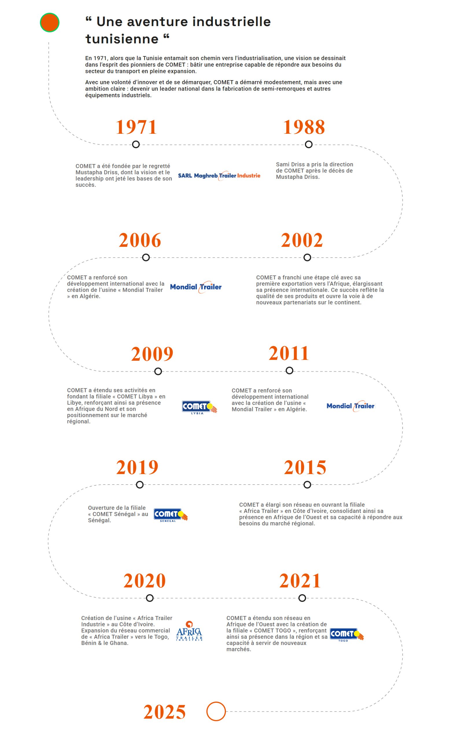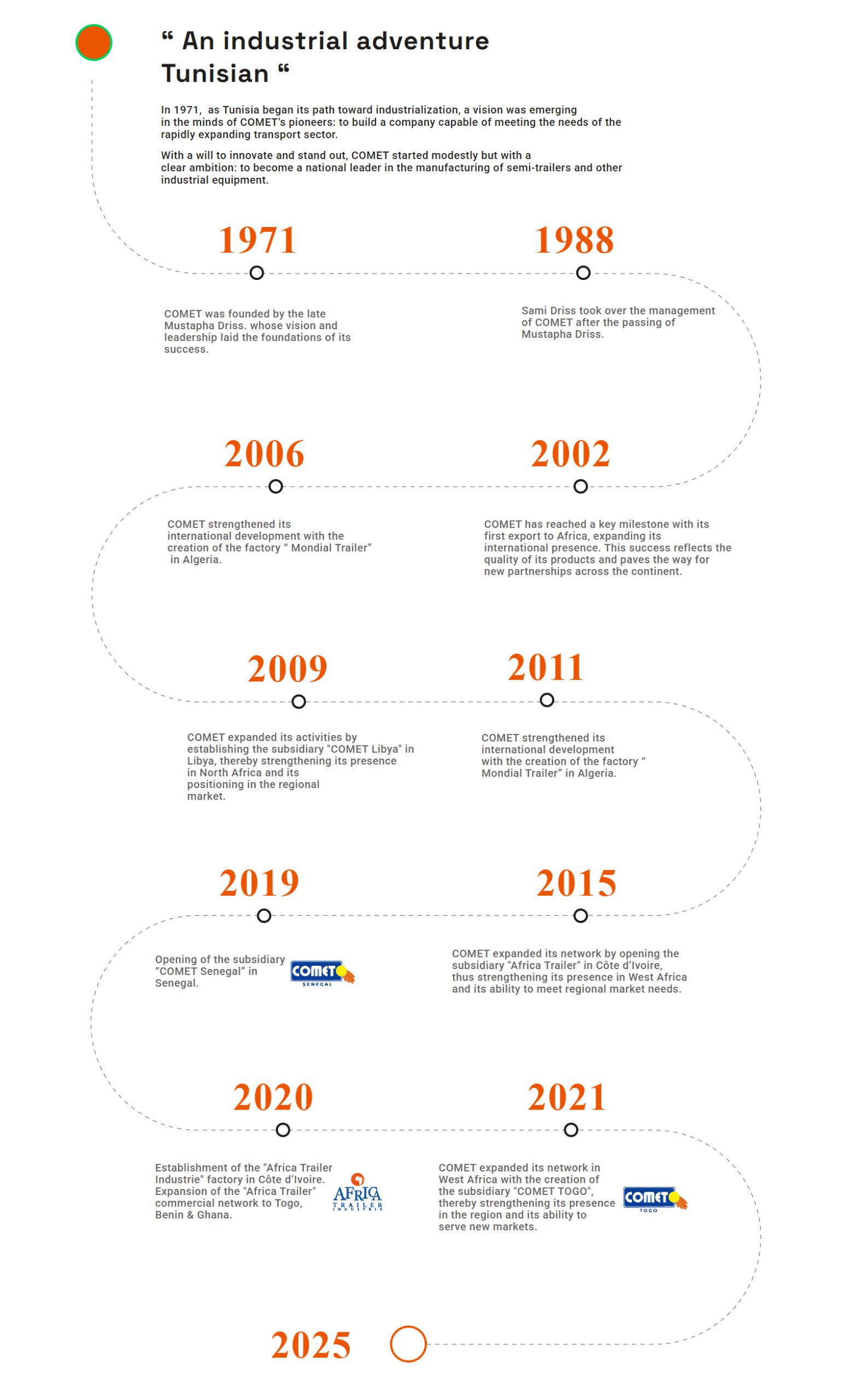 “ Une aventure industrielle tunisienne “ En 1971, alors que la Tunisie entamait son chemin vers l'industrialisation, une vision se dessinait dans l'esprit des pionniers de COMET : bâtir une entreprise capable de répondre aux besoins du secteur du transport en pleine expansion. Avec une volonté d’innover et de se démarquer, COMET a démarré modestement, mais avec une ambition claire : devenir un leader national dans la fabrication de semi-remorques et autres équipements industriels. 1971 2006 COMET a été fondée par le regretté Mustapha Driss, dont la vision et le leadership ont jeté les bases de son succès. 1988  Sami Driss a pris la direction de COMET après le décès de Mustapha Driss. 2011 COMET a renforcé son développement international avec la création de l’usine « Mondial Trailer » en Algérie. COMET a renforcé son développement international avec la création de l’usine « Mondial Trailer » en Algérie. 2019 Ouverture de la filiale « COMET Sénégal » au Sénégal. 2020 Création de l’usine « Africa Trailer Industrie » au Côte d’Ivoire. Expansion du réseau commercial de « Africa Trailer » vers le Togo, Bénin & le Ghana. 2021 COMET a étendu son réseau en Afrique de l’Ouest avec la création de la filiale « COMET TOGO », renforçant ainsi sa présence dans la région et sa capacité à servir de nouveaux marchés. 2002 COMET a franchi une étape clé avec sa première exportation vers l’Afrique, élargissant sa présence internationale. Ce succès reflète la qualité de ses produits et ouvre la voie à de nouveaux partenariats sur le continent. 2009 COMET a étendu ses activités en fondant la filiale « COMET Libya » en Libye, renforçant ainsi sa présence en Afrique du Nord et son positionnement sur le marché régional. 2015 COMET a élargi son réseau en ouvrant la filiale « Africa Trailer » en Côte d’Ivoire, consolidant ainsi sa présence en Afrique de l’Ouest et sa capacité à répondre aux besoins du marché régional. 2025