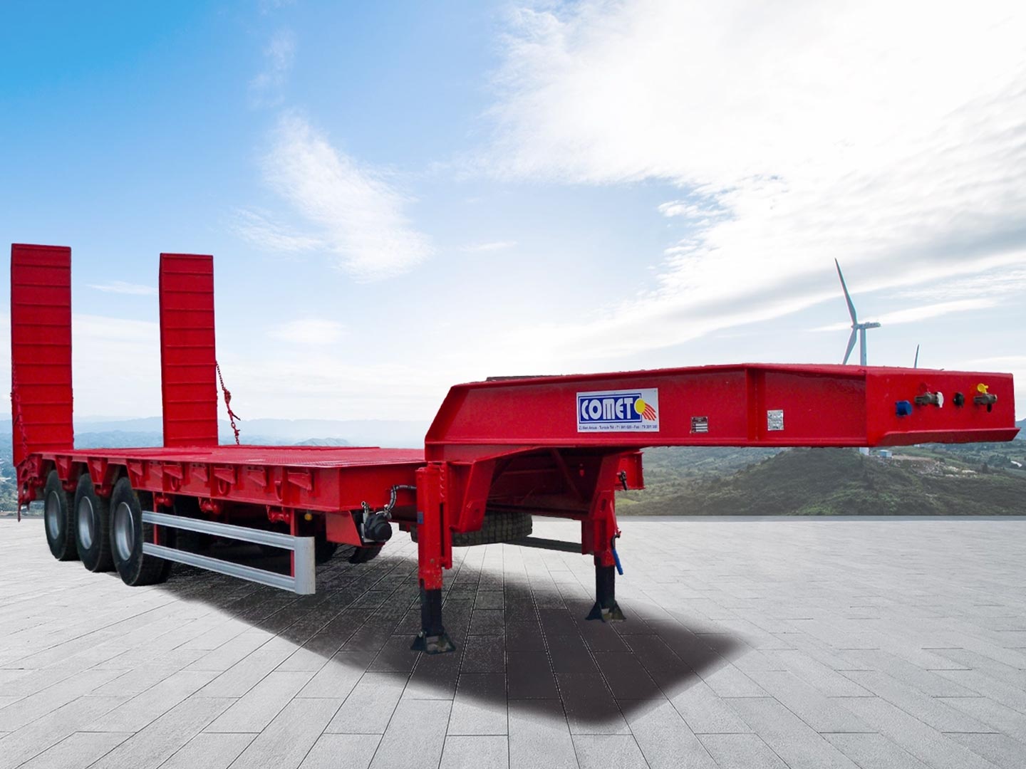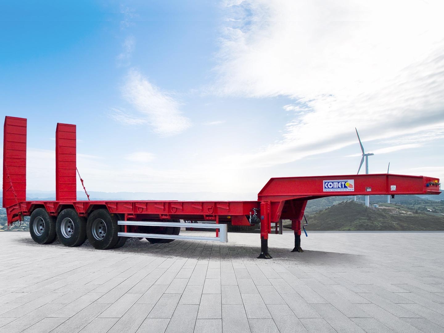 La semi-remorque porte-engins surbaissée à 3 essieux de COMET peut transporter des charges allant jusqu’à 45 tonnes, adaptée aux équipements lourds et surdimensionnés.